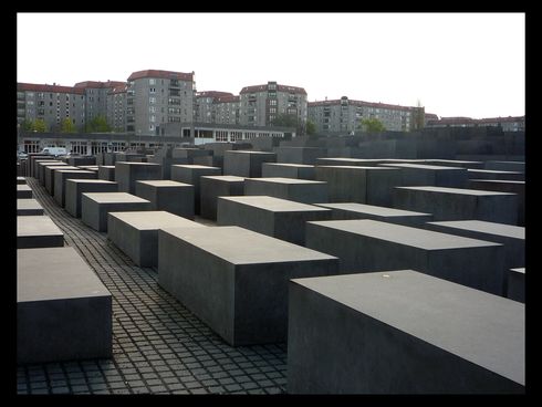 Po průchodu Braniborskou bránou se ocitáme v moderní části Berlína. Cestou k Sony a Daimler Center procházíme okolo, spíše skrz, židovského památníku. Jedná se o šedivé kvádry různé výšky, vystavěné v pravidelných řadách na 13 000 m2. Dostavěn byl v roce 2005. Při bloudění v uličkách mezi kvádry na člověka doléhá pocit, že není úniku...