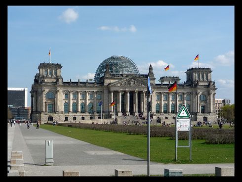 Teď už se tedy vracíme k berlínskému parlamentu a řadíme se do fronty. Asi za hodinku se dostáváme dovnitř, procházíme kontrolou a vyjíždíme výtahem vzhůru. Je odtud nádherný výhled na celý Berlín. Ve skleněné kopuli se vydáváme po točité rampě až do jejího vrcholu. Zde je v kruhu lavička, z níž je možné dívat se na nebe, jelikož kopule není uzavřená. Po druhé rampě scházíme dolů. Ještě se chvilku bavíme našimi odrazy v centrálním sloupu kopule a poté už sjíždíme výtahem zase dolů.