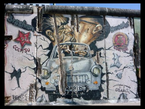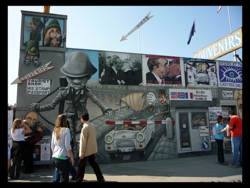 Čtvrtý den máme na programu východní Berlín, místní nádraží vyvolává na rtech jemný úsměv, v porovnání se západním je to nesrovnatelné. Žádná pořádná hala, všude plno odpadků. U Berlínské zdi je konečně mapka, kde přesně se Berlín půlí na východní a západní. Ze zdi je udělána East side gallery.